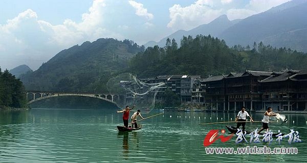 ??? 夕陽(yáng)西下,幾只漁船在江面上搖晃,宛如一片片 樹(shù)葉在江中漂浮。漸漸地,小船向岸邊靠過(guò)來(lái)。一只小船上有兩個(gè)人, 一個(gè)劃槳,一個(gè)拽著魚(yú)網(wǎng)上的繩索。小船在裊裊炊煙中駛回了碼頭,有頑皮的孩子正站在碼頭上翹首等待,大概是想看看漁人今兒收獲了多少。遠(yuǎn)處的風(fēng)雨廊橋上傳來(lái)了婉轉(zhuǎn)好聽(tīng)的土家族音樂(lè),是那首土家人熟悉的《小南海漁歌》。站在吊腳樓上望著三三兩兩晚歸的人們,眼前的濯水不正應(yīng)了那一句“漁歌唱晚行人歸”嗎?