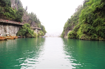一行人很快踏上了游船,伴隨著船漸漸駛?cè)雿{谷,兩岸巨石高聳,擎天入云,船兒驚起幾只白鷺,撲騰著翅膀飛向遠(yuǎn)空。我坐在船邊,蓬頂離我的頭有砥三寸,游客兩手可以擱在左右的弦上,還可以附身把手伸到水里。我有一種直覺,仿佛這種船是在水面上坐,當(dāng)它靠近兩岸如畫般的美景時,山泉的甘甜便于你的眼鼻更加接近。