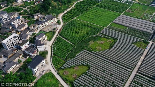 ↑2020年6月6日,重慶市黔江區馮家街道寨子社區官村古寨與現代農業園相互映襯。(無人機照片)CICPHOTO/楊敏 攝