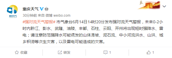 重慶市氣象臺(tái)6月14日14時(shí)20分發(fā)布強(qiáng)對(duì)流天氣警報(bào),未來(lái)0-2小時(shí)內(nèi)黔江、彭水、武隆、涪陵、豐都、石柱、云陽(yáng)、開州將出現(xiàn)短時(shí)強(qiáng)降水、雷電;請(qǐng)注意防范強(qiáng)降水可能誘發(fā)的山體滑坡、泥石流、中小河流洪水、山洪、城鄉(xiāng)積澇等次生災(zāi)害,以及雷電可能造成的災(zāi)害。
