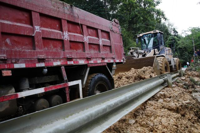 ↑6月13日,車輛在重慶市黔江區金洞鄉楊家社區清理道路淤泥。新華社發(楊敏 攝)