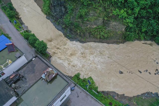 這是7月1日在重慶市黔江區金溪鎮平溪村拍攝的袁溪河洪水(無人機照片)。