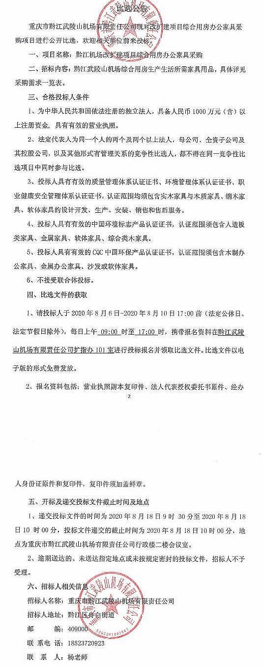 《重慶市黔江武陵山機場有限責任公司改擴建項目綜合用房家具采購項目公開比選公告》