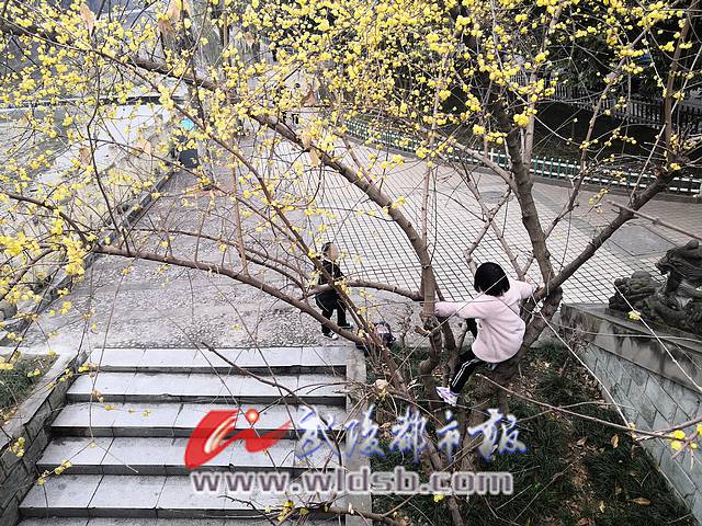 記者在臘梅花前停留了一段時間,期間有不少小孩路過便伸手摘花,甚至攀爬樹木,摘花搖樹,一側摘不到又換到另一側,看著十分危險,同時還在口中念著,“今天我一定要摘到,這邊不行去那邊摘,就不信摘不到。”