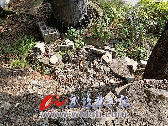 當日上午,記者在現(xiàn)場看到,這些碎磚頭堆積在公路邊的斜坡上,還有許多碎石塊,據(jù)觀察是此地公路邊沿的路表被壓壞,沿著斜坡滾到了一起。龔女士指著這些碎磚對記者說:“你看這些碎磚亂七八糟的堆在一起,把這棵大樹的底部完全淹沒了(如圖)。加上碎磚頭如果受大風、暴雨等外力影響,很容易沿著斜坡滾落到下面的河濱步道上,有很大的安全隱患?!?/p>