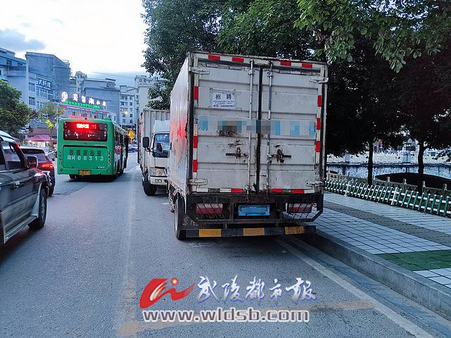 接到群眾反映后,記者立即前往鄔楊橋公交站臺查看情況。在現場可以看到,鄔楊橋公交車??奎c停放了兩輛中型貨車,而公交車則被迫??吭诘缆分醒肷舷驴?,這也導致后方車輛難以通行,造成了道路擁堵。