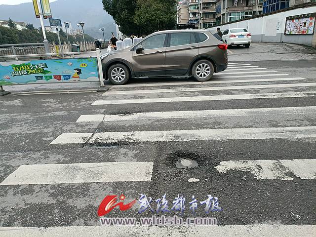 當日上午,記者在現場看到,該人行道斑馬線上有兩三個四十厘米見方的小坑洞,路過的車輛很難繞開,行人也常常因踩進坑里站不住腳。