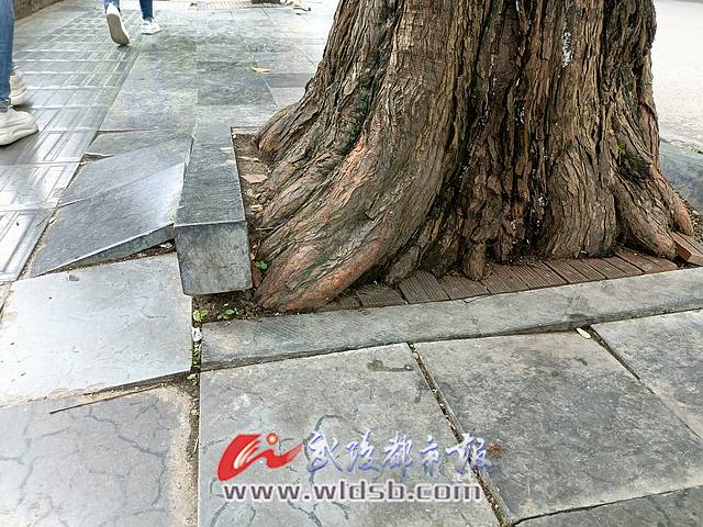 記者在現場發現,這里的行道樹因根系發達,導致樹蓋池和附近的地磚都被撐得變了形,有幾處行道樹的樹根部,周圍的石條圍欄翹離地面近10厘米(如圖),過往的行人紛紛繞道而行。
