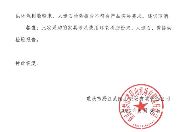 黔江武陵山機場航站樓要客區家具供貨及安裝項目比選文件部分內容異議的答復