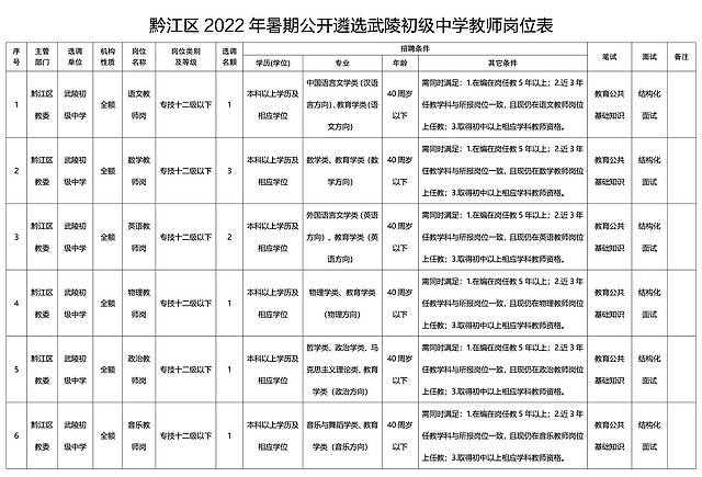 本次共遴選武陵初級中學教師9名,具體崗位見《黔江區2022年暑期公開遴選武陵初級中學教師崗位表》(附件1),以下簡稱《崗位表》。