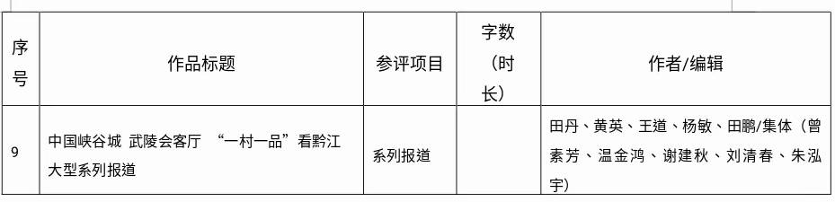 根據(jù)重慶市委宣傳部《關(guān)于開展第26屆重慶新聞獎(2023年度)評選工作的通知》(渝委宣〔2023〕18號)文件精神,3月10日對初評擬報送15件擬參評第26屆重慶新聞獎的作品進(jìn)行了公示,因9號作品系列報道《中國峽谷城 武陵會客廳“一村一品”看黔江大型系列報道》的作者、編輯一欄內(nèi)容發(fā)生變更,現(xiàn)補充公示5個工作日。公示如下: