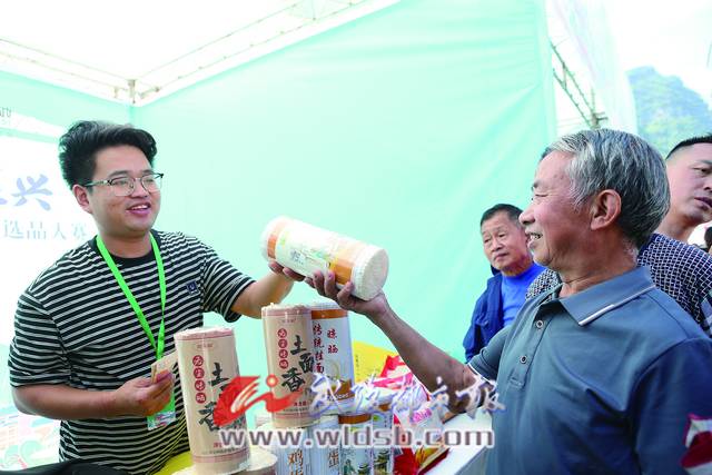 “二姑爺”請喝黃金茶,“陳隊長”來嘗嘗地牯牛,大家快來看,咱家的臘肉聞起很香,吃起很巴適……42家參展企業(yè)促銷員,在展柜里“吆喝”著自己的產(chǎn)品。