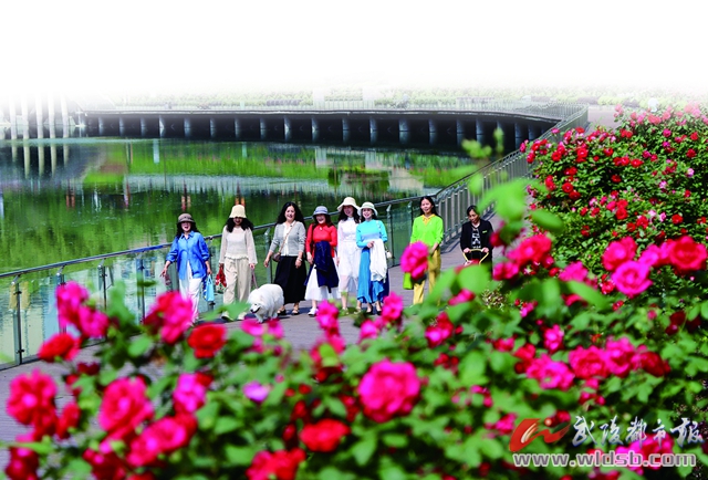 市民在月季長廊觀賞拍照
